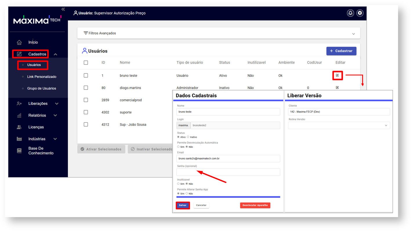 3- Selecione o usuário representante desejado e clique sobre o ícone de Editar