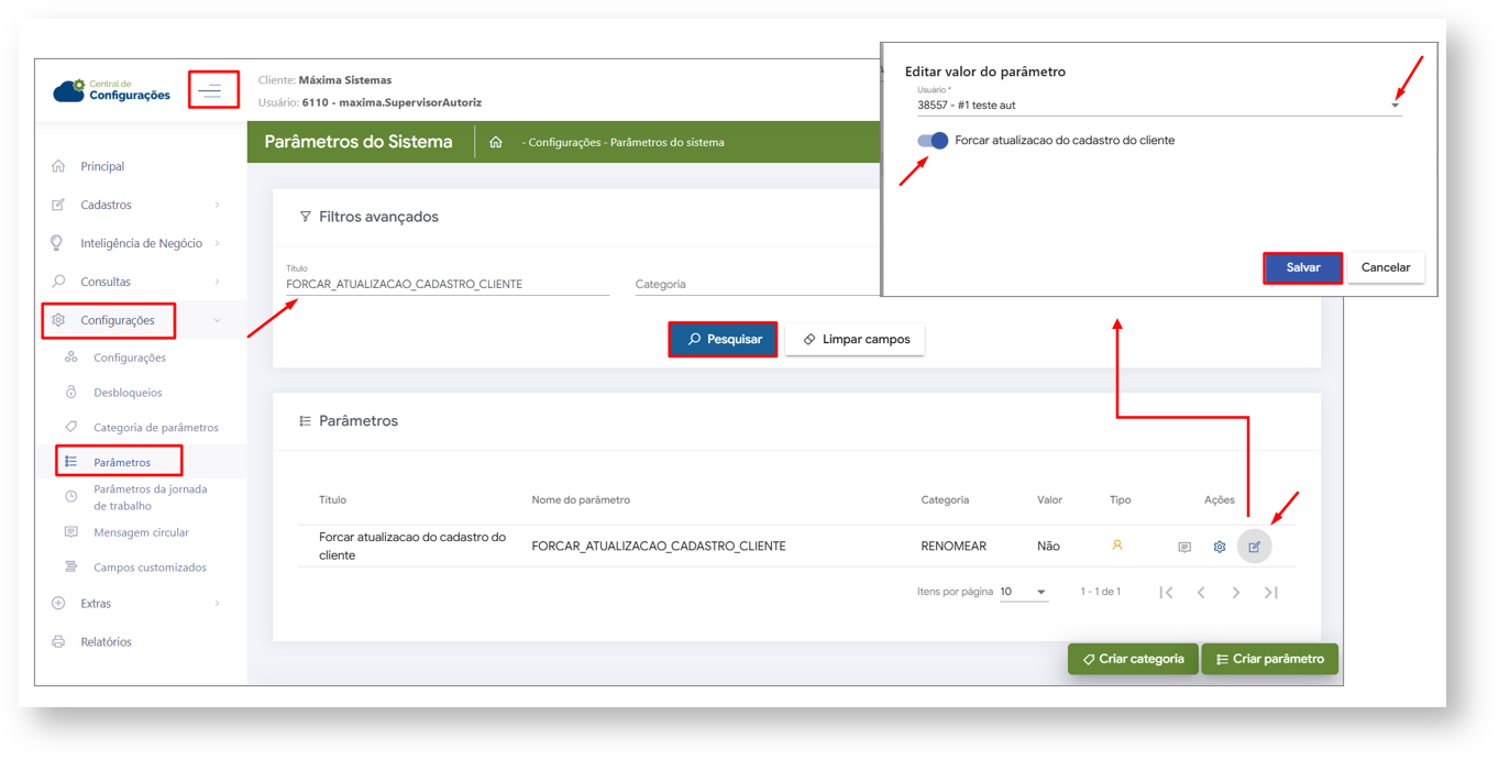 2- Busque pelo parâmetro FORCAR_ATUALIZACAO_CADASTRO_CLIENTE, clique em pesquisar