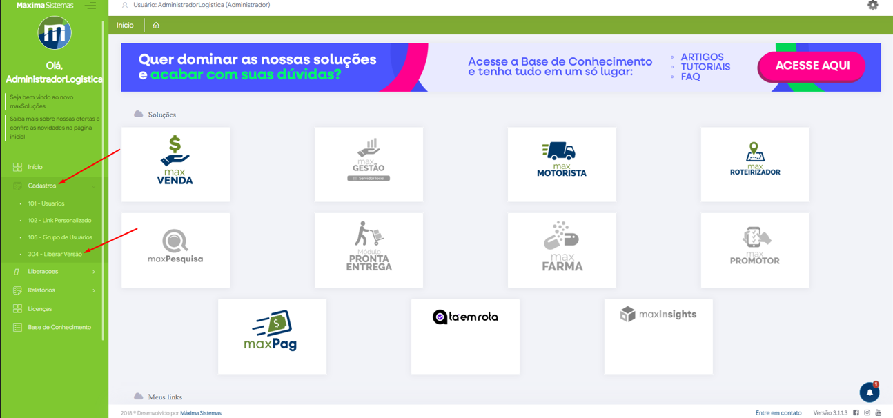 - Ao realizar o login no APPSV (maxSoluções) da Máxima, clicar em Cadastros e acessar a opção Liberar Versão: