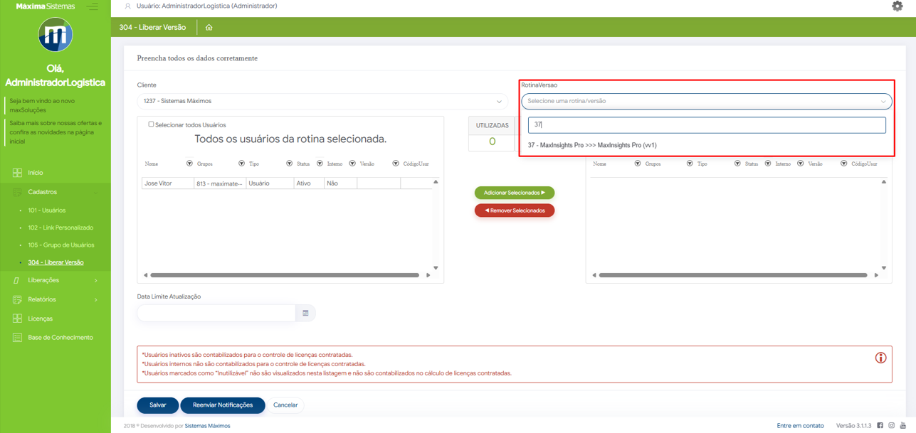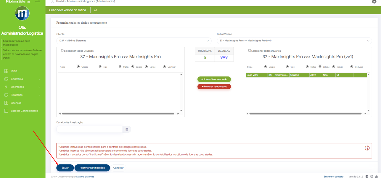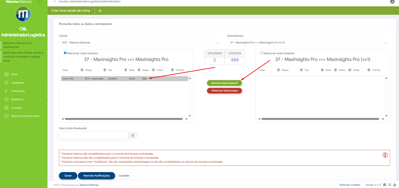 4. Selecionar o usuário e clicar em Adicionar Selecionados: