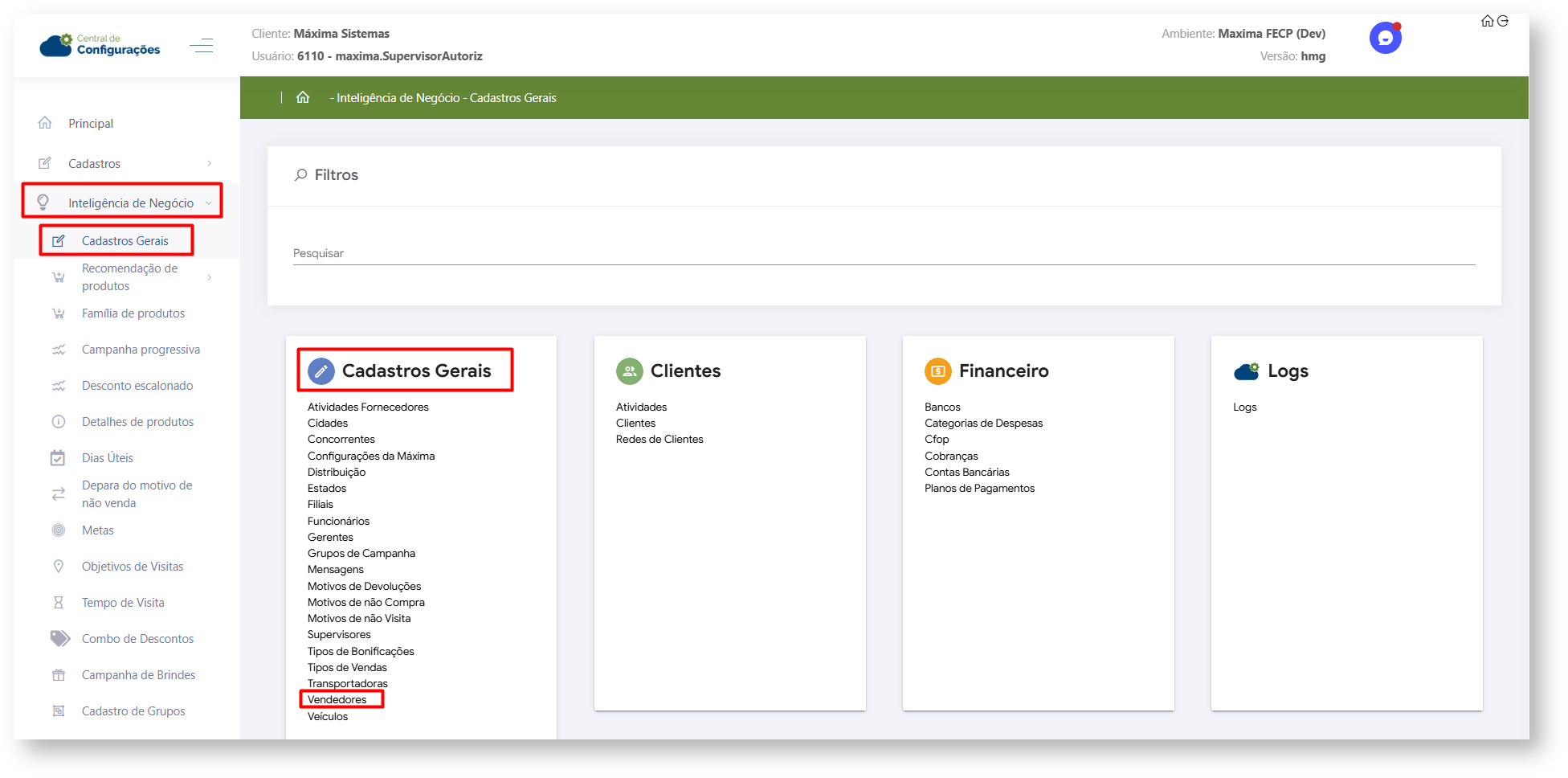 1- Acesse a Central de configurações do maxPedido, Menu lateral> Inteligência de Negócios> Cadastros Gerais