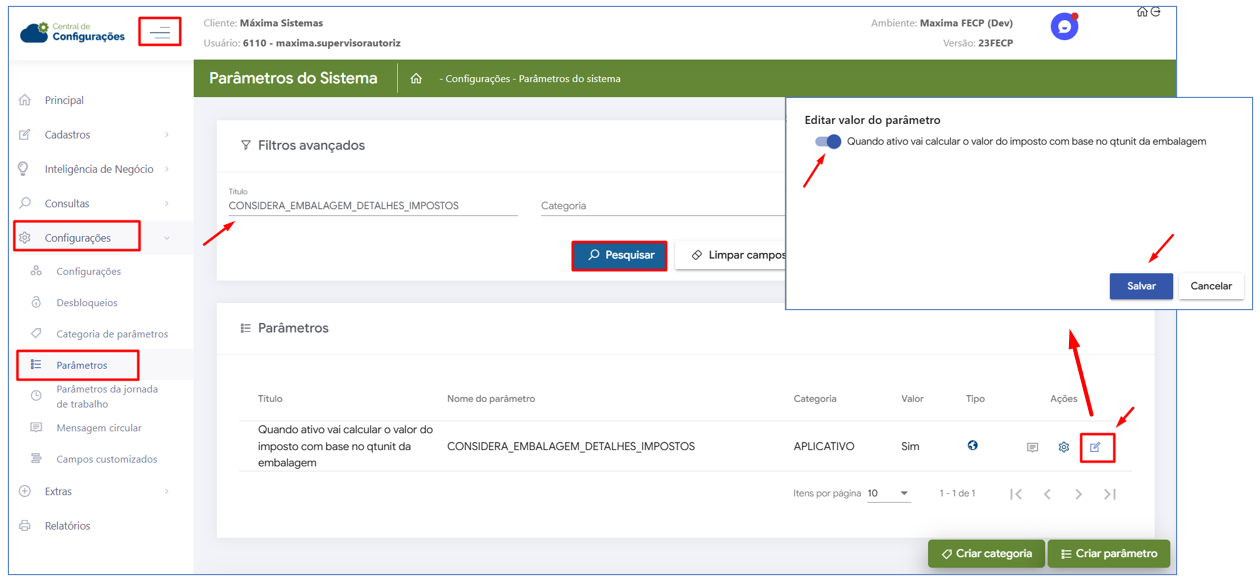 2- Busque pelo parâmetro CONSIDERA_EMBALAGEM_DETALHES_IMPOSTOS clicando em pesquisar em filtro