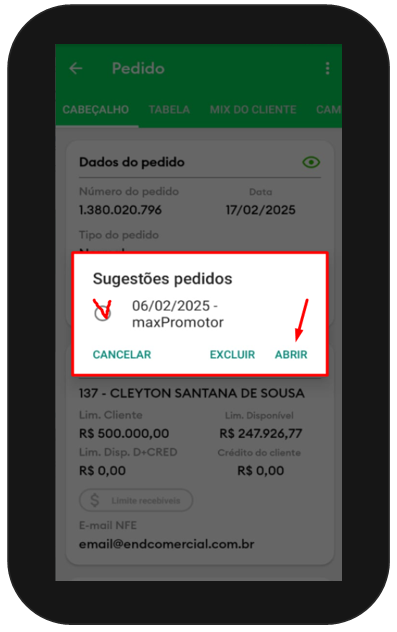 2-Para utilizar a sugestão clique em abrir, caso não queria utilizar clique em cancelar ou excluir a sugestão.