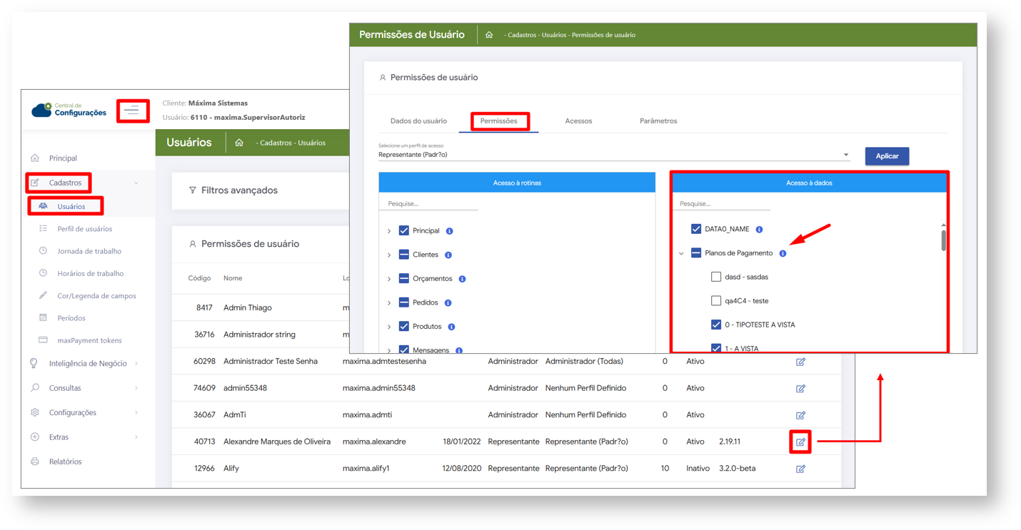 2- Selecione o usuário desejado e clique sobre o ícone de editar na coluna Ações
