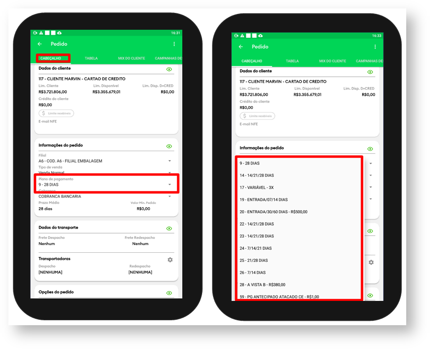 5- No Aplicativo os planos de pagamento liberados podem ser vistos ao iniciar um Pedido
