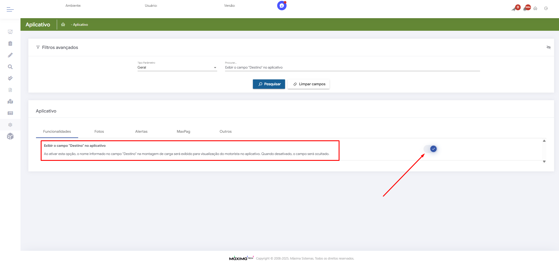 2-Depois é preciso procurar pelo parâmetro Exibir o campo "Destino" no aplicativo, e desativar o parâmetro: