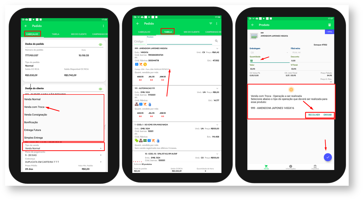 | Ao marcar enviar indica que o produto em questão é o que irá para o cliente, e ao marcar recolher indica o produto que irá retornar do cliente na troca. |