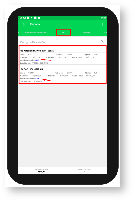 5- Após inserir os produtos clique na Aba Itens, nela poderá visualizar os produtos inseridos tanto para envio quanto retorno. Caso o produto de envio e o de retorno forem o mesmo valor eles ficaram com informação de bonificado, indicando que não haverá transação financeira na operação.