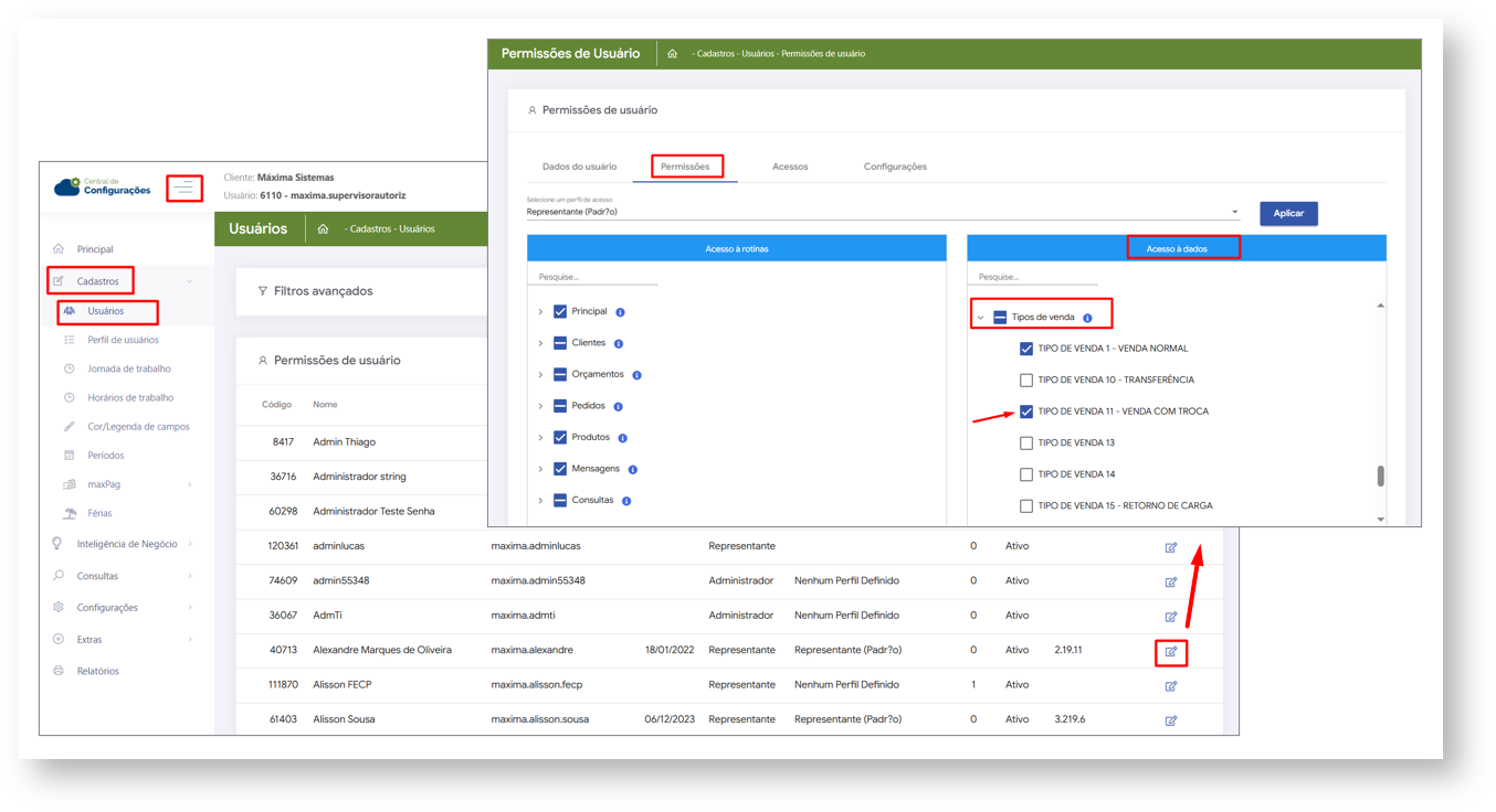 3- Clique na Aba Permissões> quadro de Acesso à Dados>Tipo de venda e marque a opção Tipo de venda 11- Venda com Troca