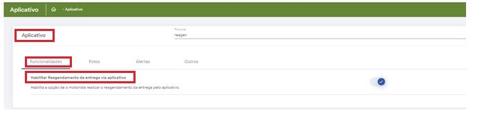 - Na aba Funcionalidades, habilitar o parâmetro "Habilitar Reagendamento da Entrega via Aplicativo".