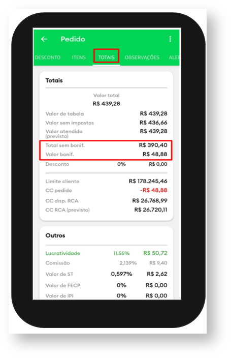 4- Para verificar a porcentagem inserida clique na aba Totais na confecção do Pedido.