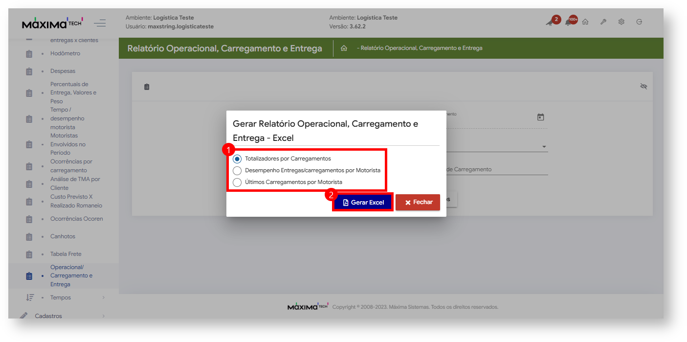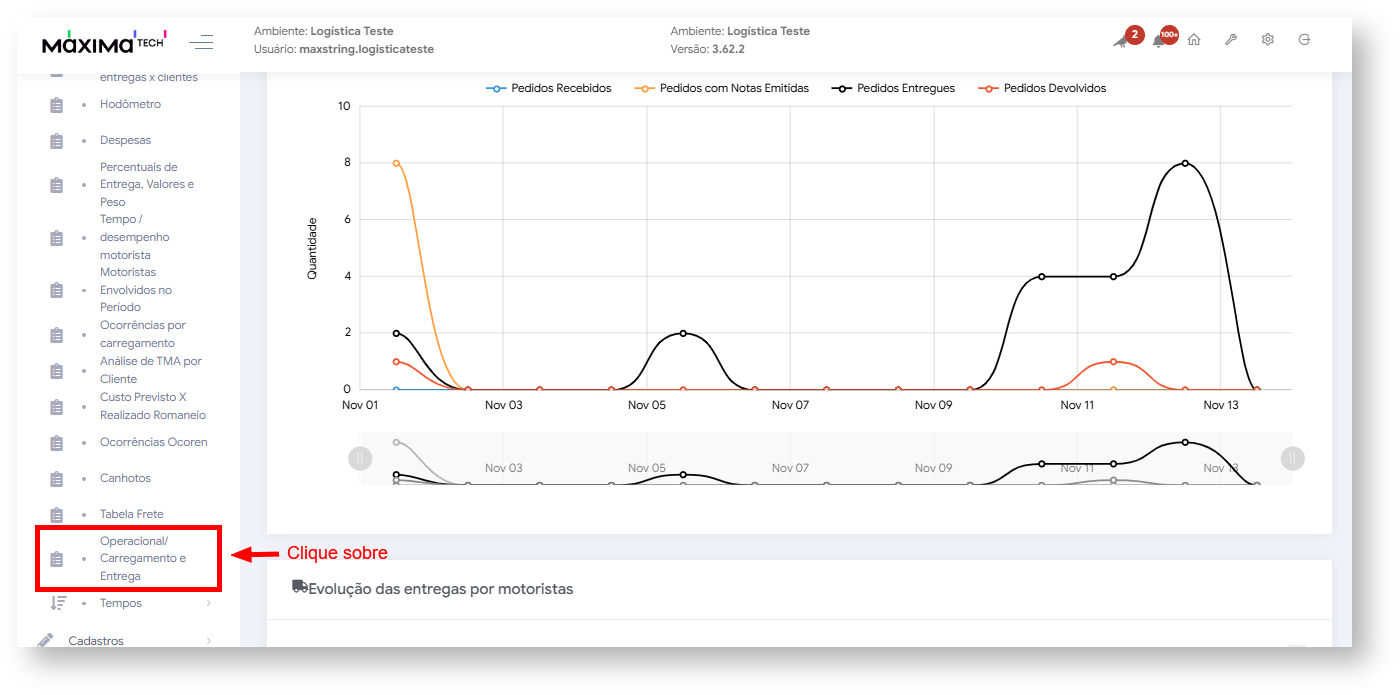 2 - No menu lateral em Relatórios, procure por Operacional, Carregamento e Entrega, clique sobre. Image Removed