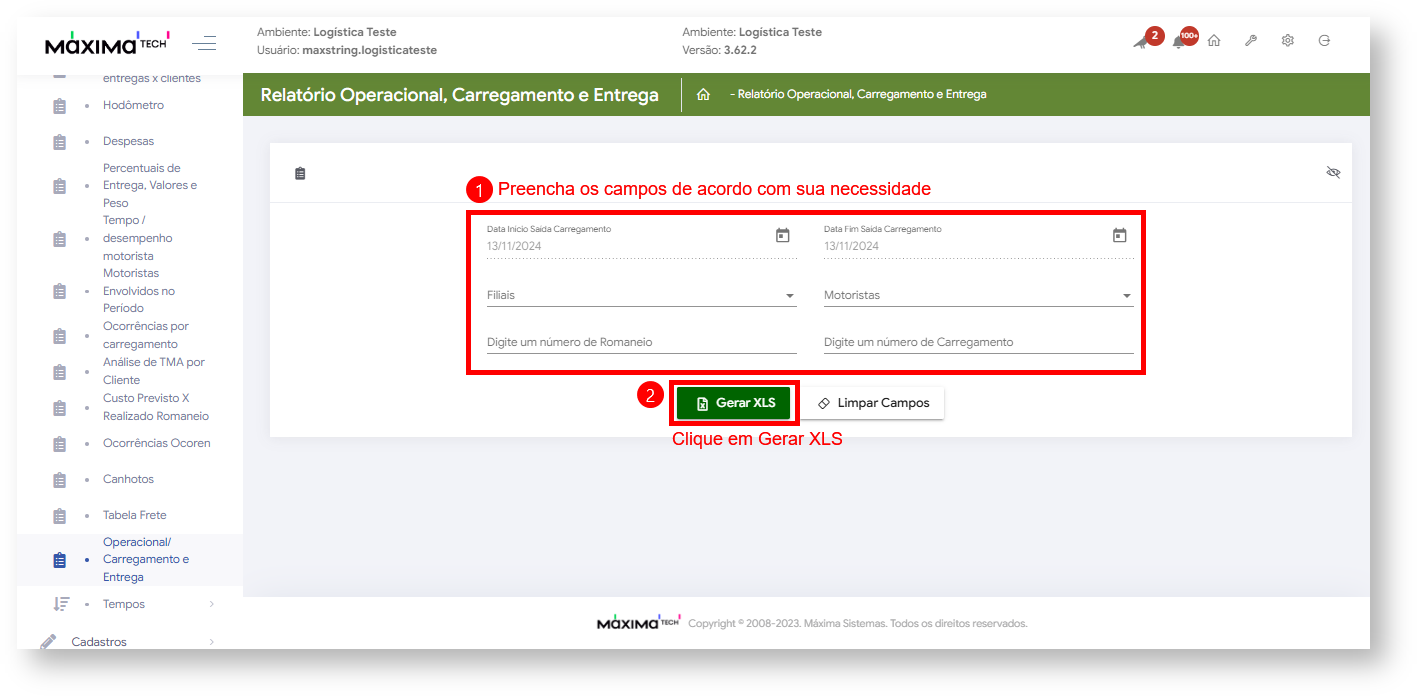 3 - Na página de Relatório Operacional, Carregamento e Entrega, preencha os campos e clique em Gerar XLS. Image Removed