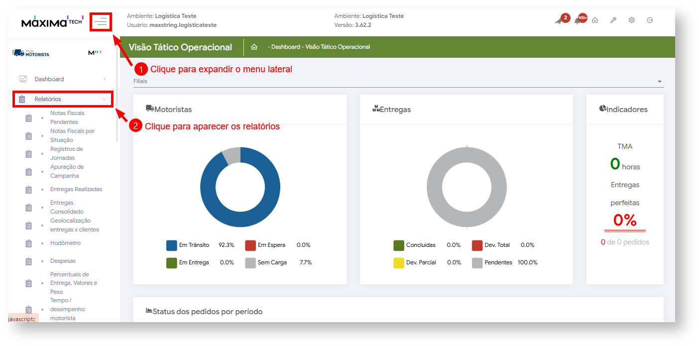 1 - Na tela inicial do maxMotorista, clique no ícone da esquerda ao lado do logotipo para expandir o menu lateral e, em seguida, clique em Relatórios para aparecer todos os relatórios disponíveis.