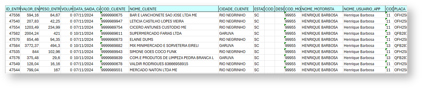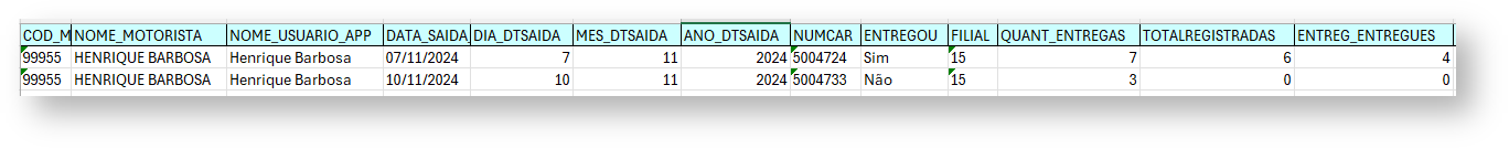 • Desempenho Entregas/carregamentos por Motorista (30 colunas)