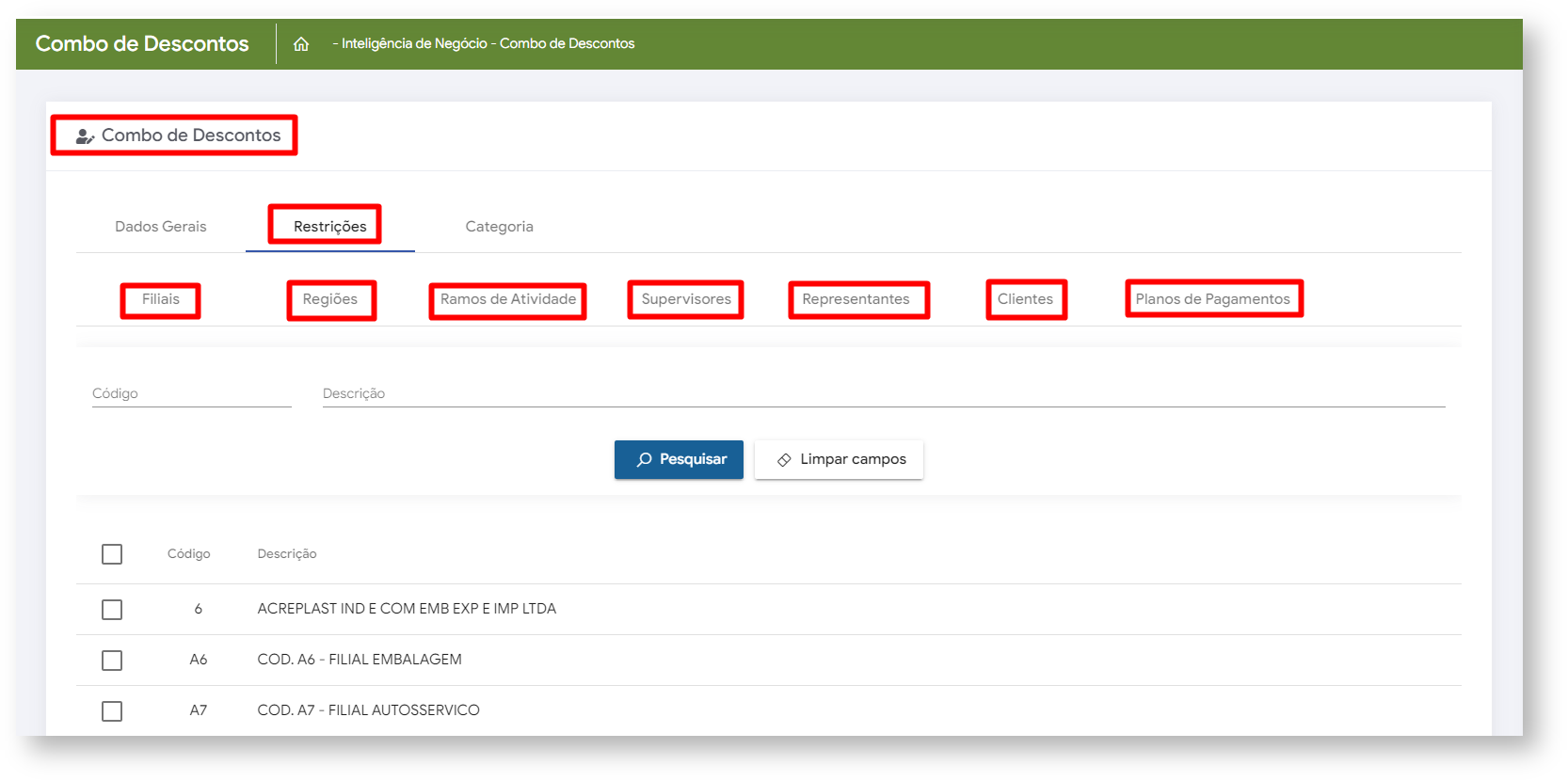 1.3 Através da Aba Restrições, é possível cadastrar restrições por Filial, Regiões, Ramos de Atividade, Supervisores, Representantes, Clientes e Planos de pagamento.