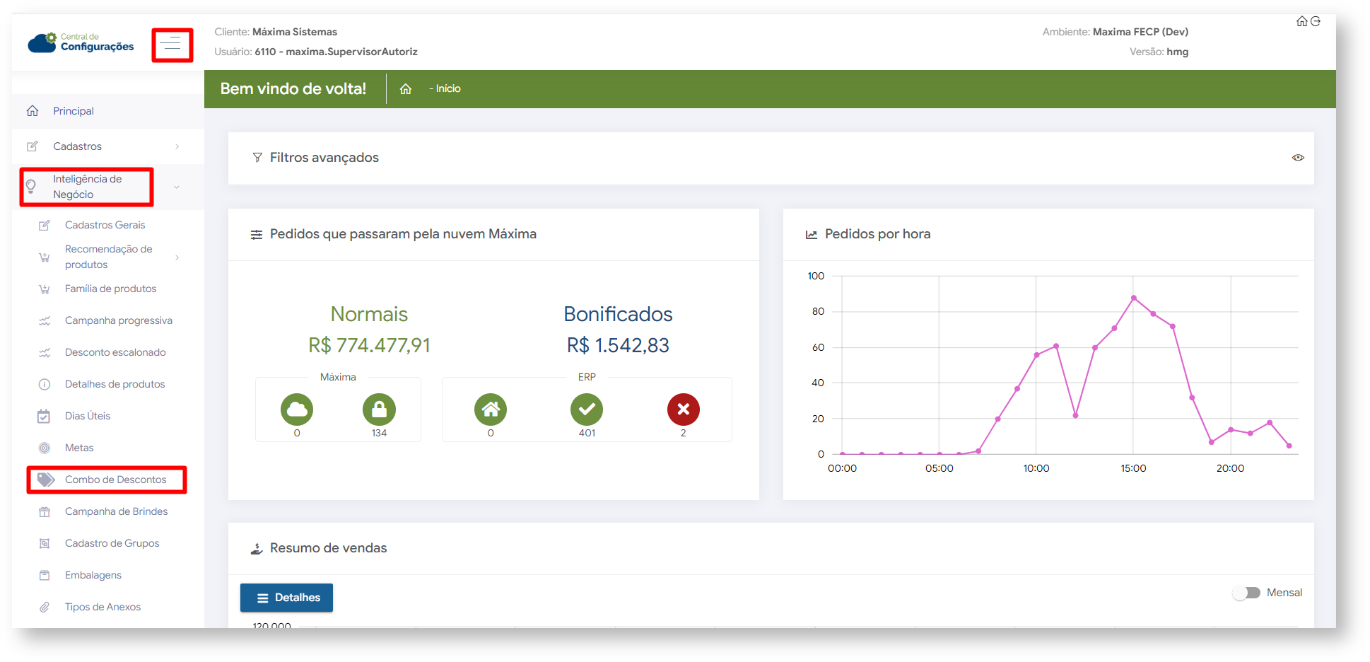 1.1 Na Central de Configurações do maxPedido no menu Inteligência de Negócio > Combo de Desconto.