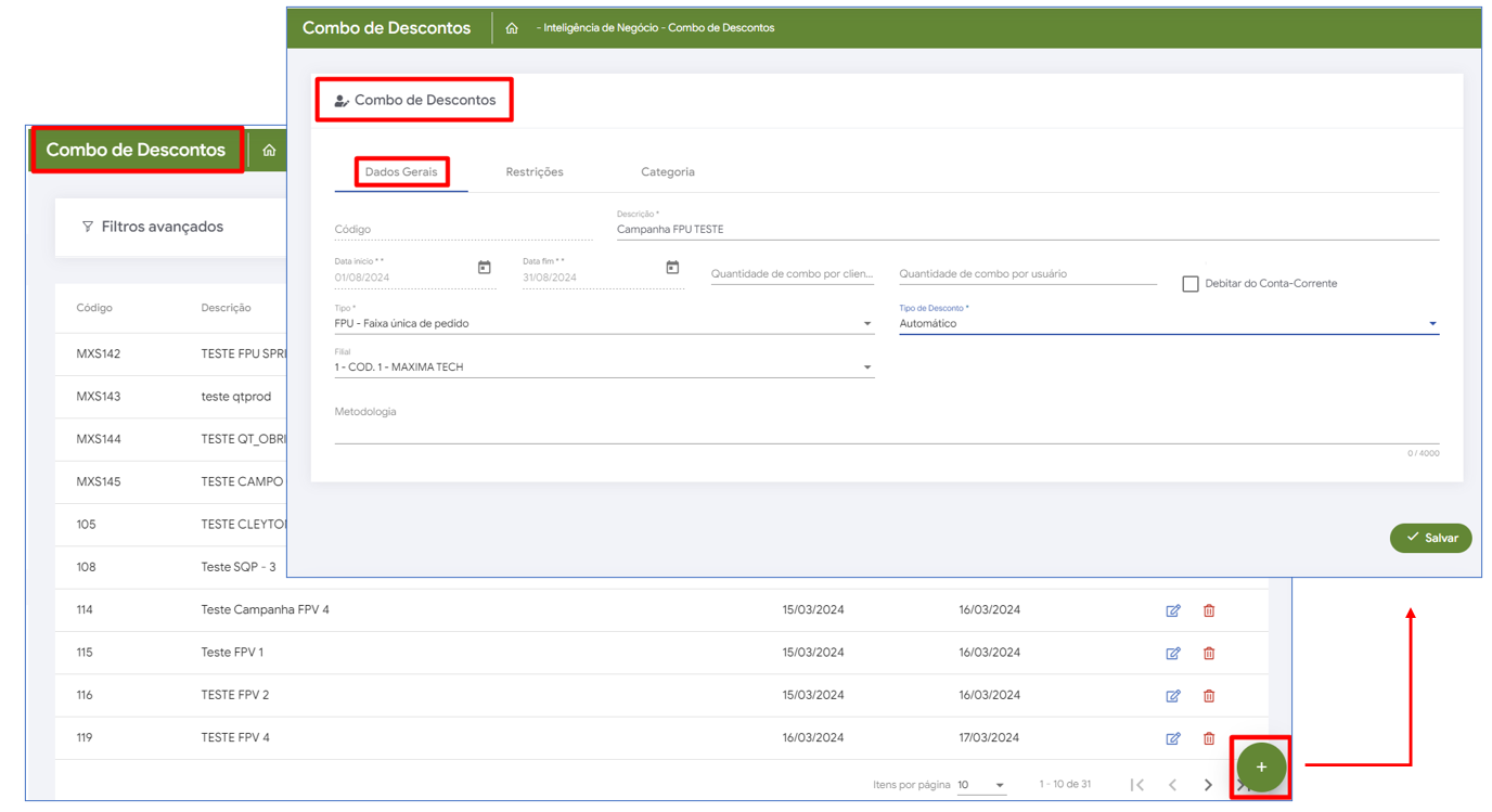, informe Descrição, Data Inicio, Data Fim e Tipo são obrigatórios, os campos Quantidade de combo por cliente, Quantidade de combo por usuário, Filial são opcionais, também é possível marcar para Debitar do conta corrente caso desejar.
