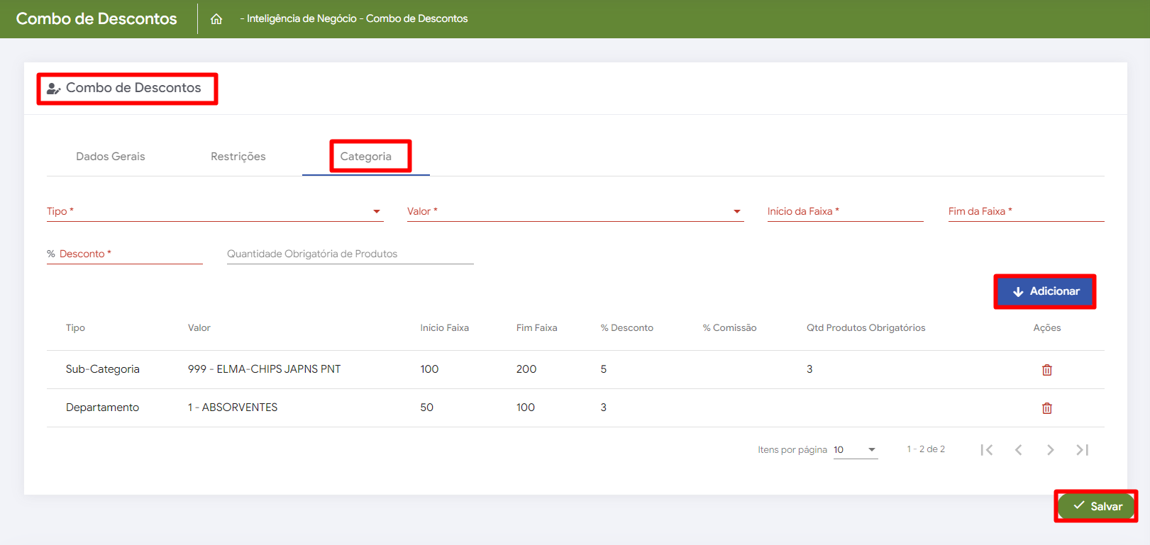 Após preencher os dados clique em adicionar, lembrando que é possível cadastrar quantas Faixas desejar cada uma com um tipo, valor, inicio e fim de faixa e desconto especifico.