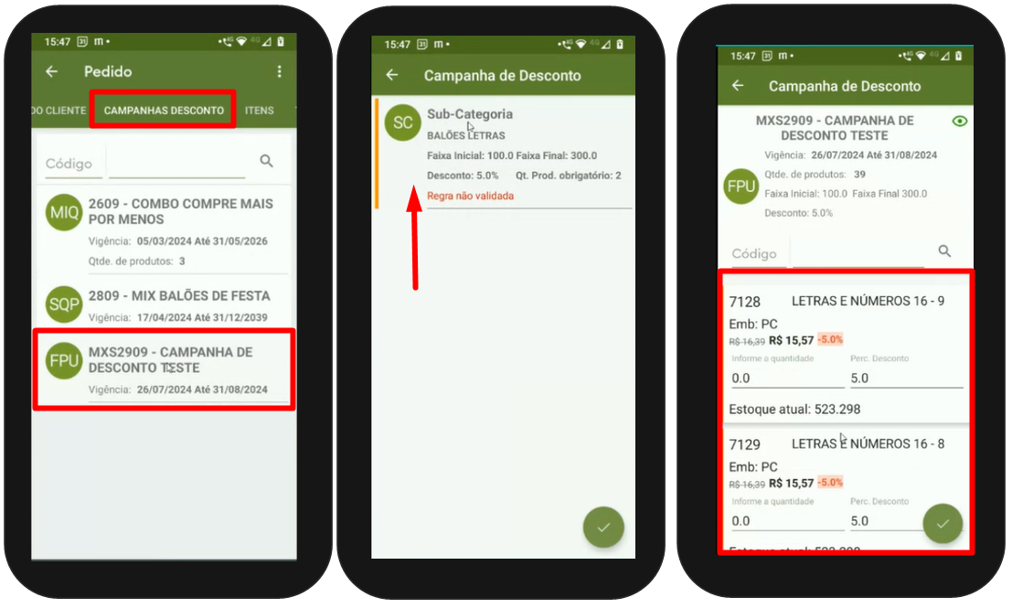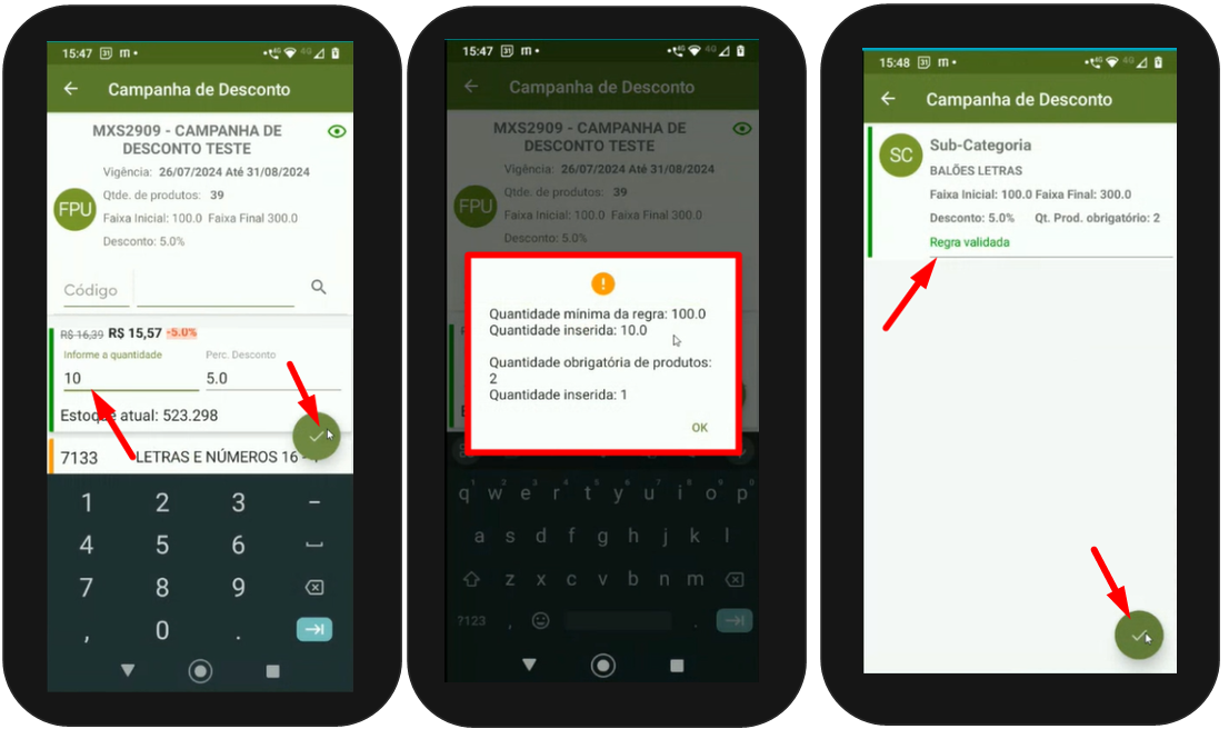 2.2 Após inserir quantidade de itens, caso a quantidade esteja abaixo da cadastrada como mínima será apresentado mensagem informando que não atende a regra da campanha devida a quantidade inserido ser abaixo, bem como se a quantidade de produtos obrigatórios cadastradas foi atendida. Após cadastrar a quantidade correta tanto de produtos quanto de produtos obrigatórios na tela da campanha será informando que a Regra foi validada, clique no ícone de salvar.