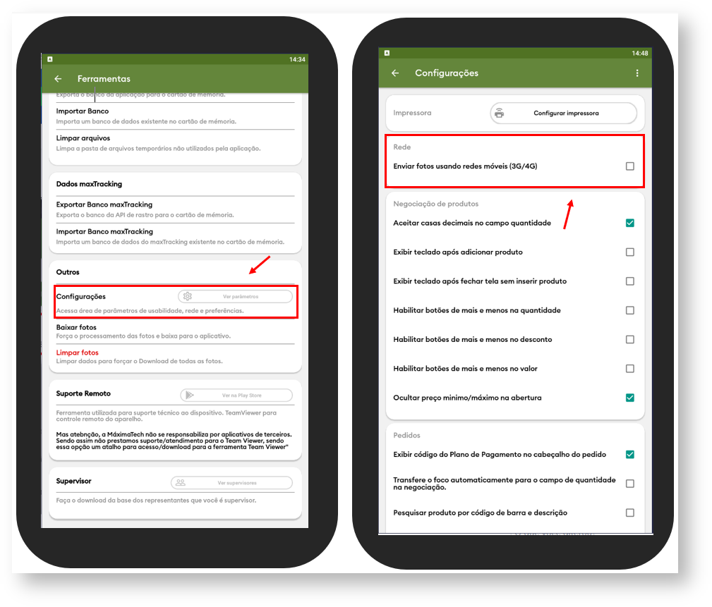 1.3 Para permitir o download das imagens utilizando a rede de dados móveis, no menu Configurações  clique em ver parâmetros e marque Enviar fotos usando redes móveis (3G/4G)