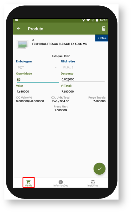 3.3 Ao clicar no produto que faz parte do Mix Ideal o aplicativo abrirá a tela de negociação para as devidas alterações e inclusão do Item no Pedido.