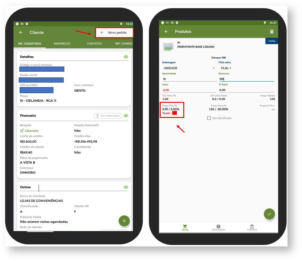 2.1 Após feito as configurações no maxPedido Web é necessário sincronizar o Aplicativo, inicie um pedido, selecione o produto e informe o desconto conforme cadastrada, Irá aparecer um símbolo quadrado com a cor referente a faixa inicial e final cadastradas no Portal antes mesmo de inserir o item.