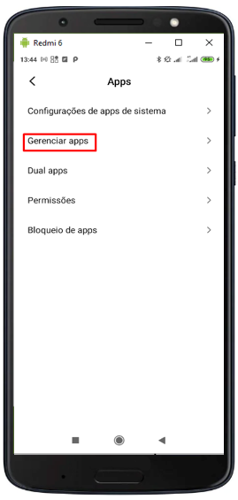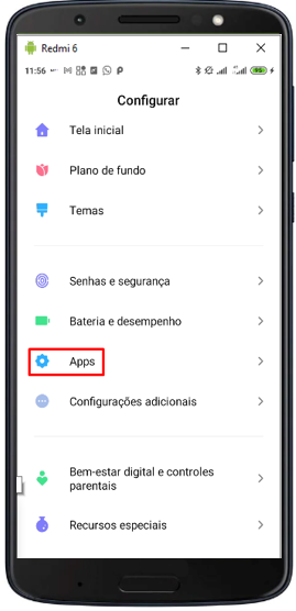 1.1 -  Na tela de configurações do aparelho, clique no menu Aplicativos;