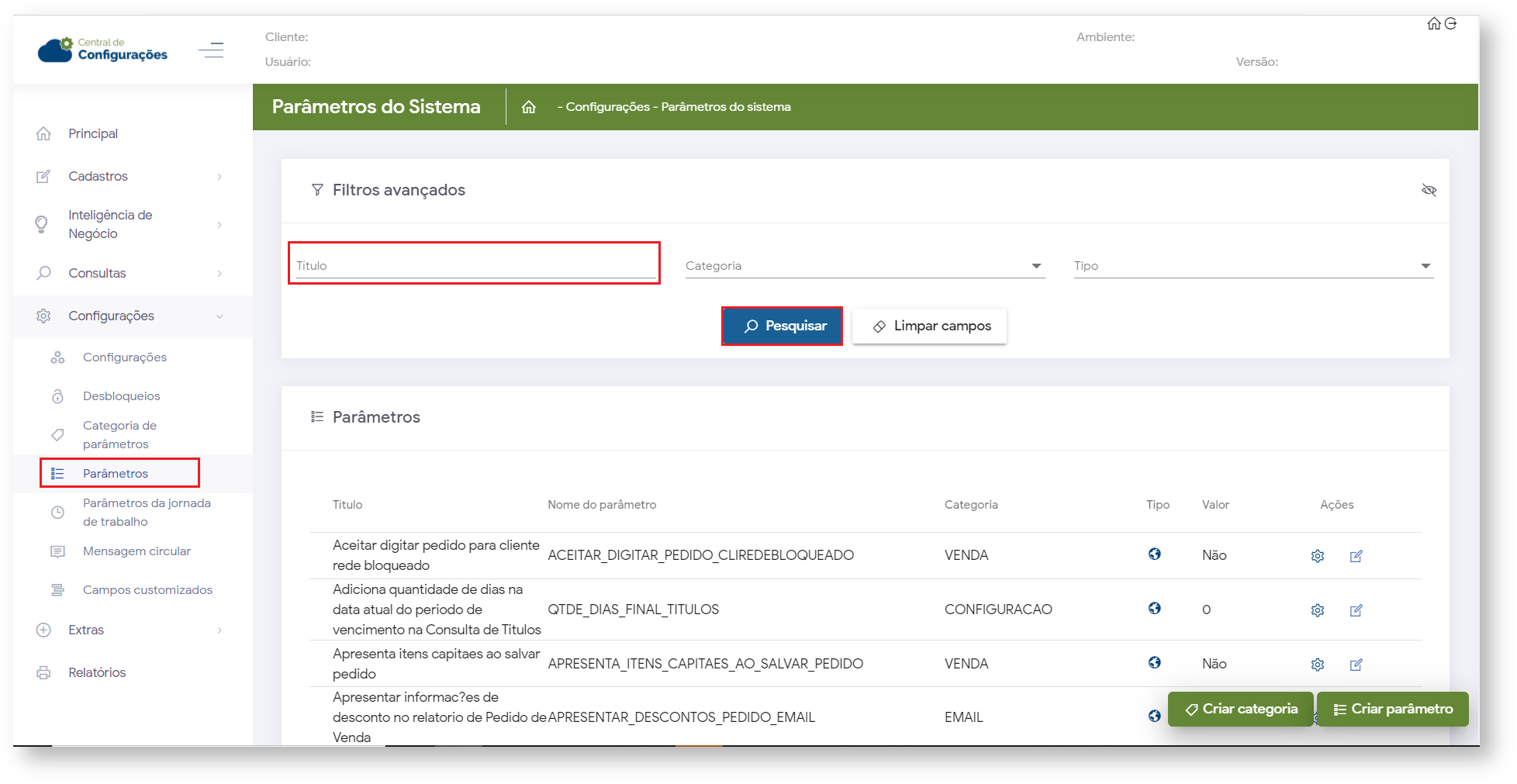 2.2 No campo de filtros avançados, busque pelo parâmetro EXIBE_LINHA_DIGITAVEL e faça a pesquisa, esse parâmetro se configurado como S(sim) vai exibir a linha digitável do titulo no menu de títulos do aplicativo, se estiver como N (não) não irá exibir a linha digitável.