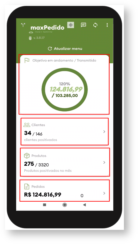 5.1 - Com um período cadastrado na filial 99, todas as informações dos cards do menu principal: objetivos em andamento, clientes positivados, produtos positivados e pedidos, serão atualizados respeitando o período, caso não haja período cadastrado, serão coletadas informações do primeiro e último dia do mês vigente.