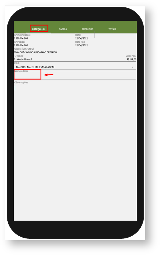 3.1 Na aba cabeçalho do pedido de indenização, será apresentado um campo alfanumérico para informar o código do lacre.