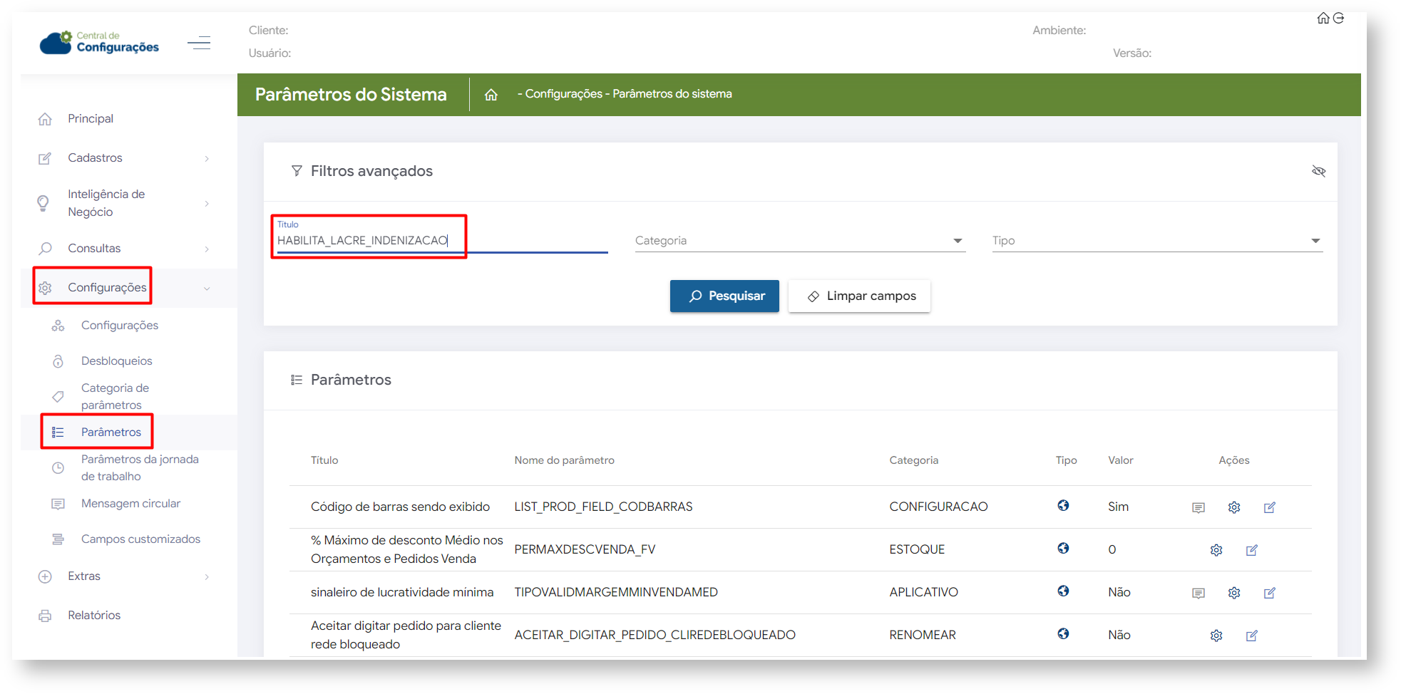 2.1.0 Para configurar o parâmetro acesse a central de configurações do maxPedido, clique em configurações e posteriormente em parâmetros pesquise o parâmetro HABILITA_LACRE_INDENIZACAO com o parâmetro habilitado, torna obrigatório informar o número do Lacre ao salvar a indenização. Para habilitar selecione o parâmetro e clique no ícone  em ações.