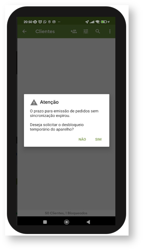 2.1 Ao final do intervalo cadastrado na Central de configurações será apresentado para o vendedor no aplicativo a informação de que ele não pode emitir pedidos sem sincronizar devido expiração do prazo e questionando se ele deseja solicitar o desbloqueio temporário. Caso ele opte por não indica que ele terá que sincronizar para emitir novos pedidos.