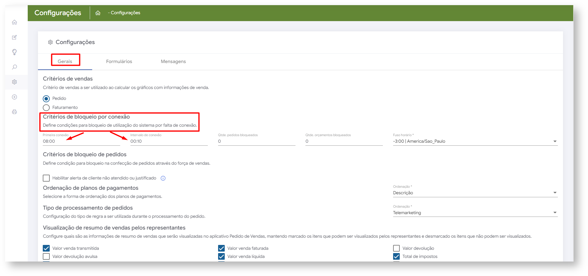 1.2 Já na tela de configurações em critérios de bloqueio por conexão determine o horário da primeira conexão e no campo intervalo determine de quanto em quanto tempo o sistema vai ser obrigado a realizar uma sincronização. Conforme o exemplo deste artigo o maxPedido vai ser obrigado a sincronizar de 10 em 10 minutos.
