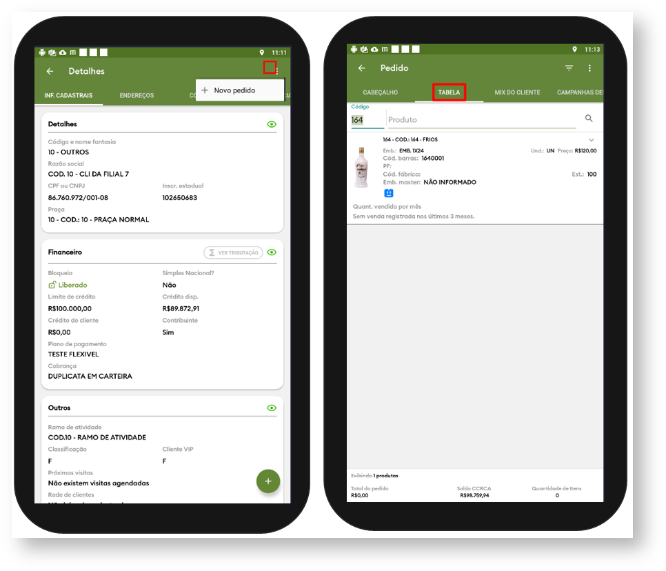 3.1 Ao selecionar a aba clientes >> Listagem de clientes >> iniciar novo pedido, clique na aba Tabela e selecione o produto.