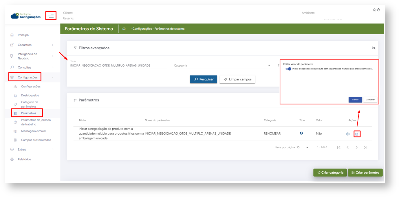 Na central de configurações do maxPedido no menu lateral clique na aba configurações>> Parâmetros, para que o fluxo funcione o parâmetro INICIAR_NEGOCIACAO_QTDE_MULTIPLO_APENAS_UNIDADE precisa ser habilitado através do ícone  de editar valor do parâmetro.