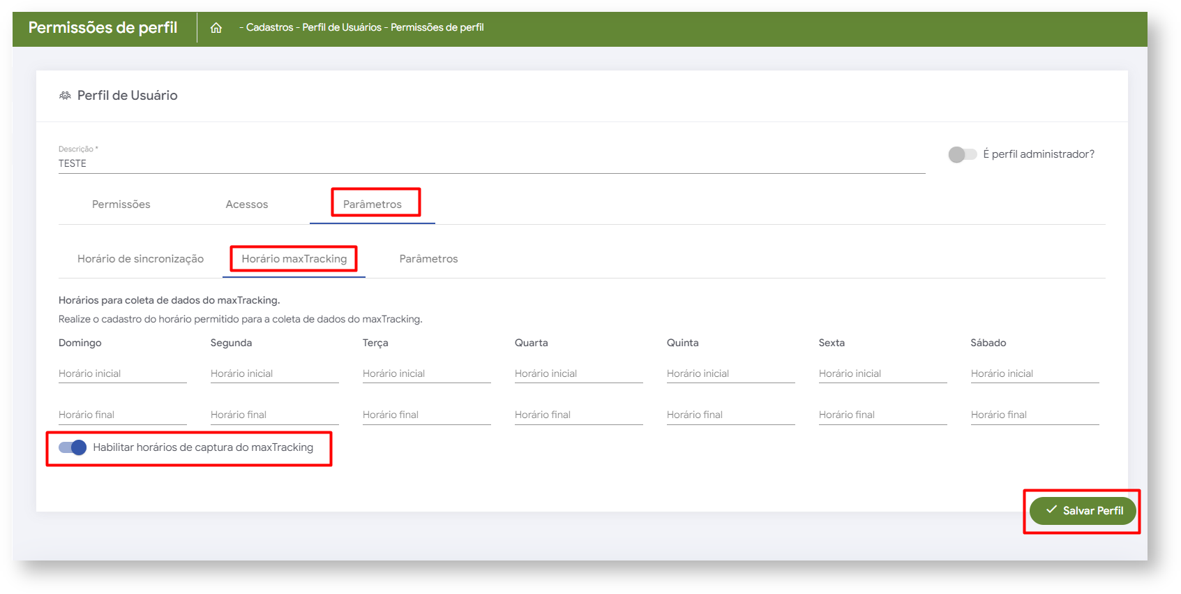 1.2 Na aba Parâmetros em horário maxTracking, defina os horários inicial e final conforme os dias da semana de acordo com a necessidade para a coleta de dados e habilite a opção Habilitar horários de captura maxTracking.