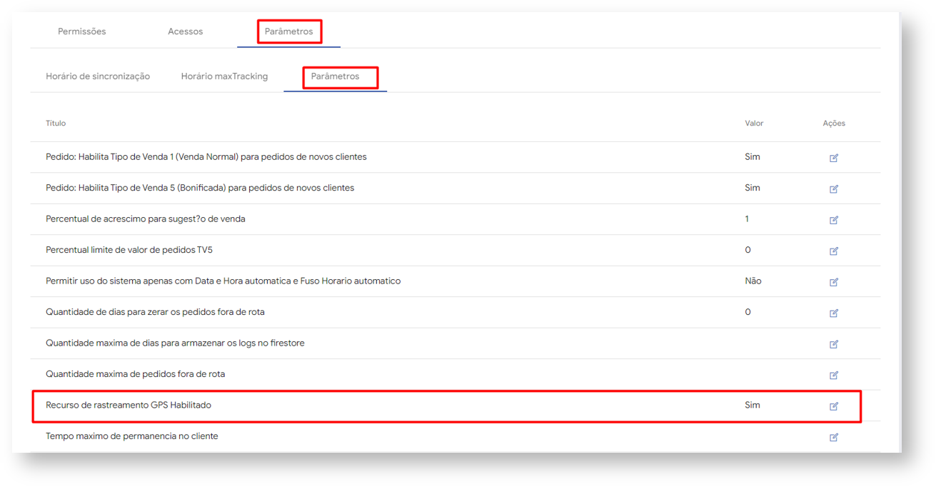 1.3 Para que o processo de horários de captura funcione verifique ainda na aba Parâmetros em parâmetros, se o Recurso de rastreamento GPS está habilitado, caso não estiver, mesmo com o parâmetro de Habilitar horários de captura maxTracking  habilitado, não será validado.