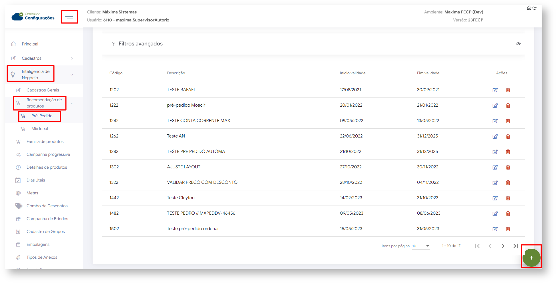 - Data inicial e final - Inicio e fim para validade desse pré-pedido