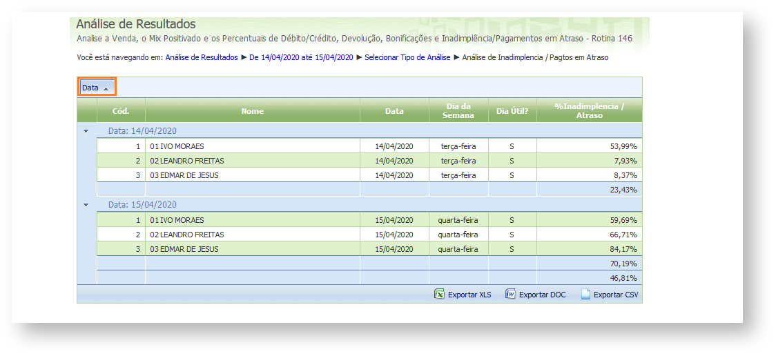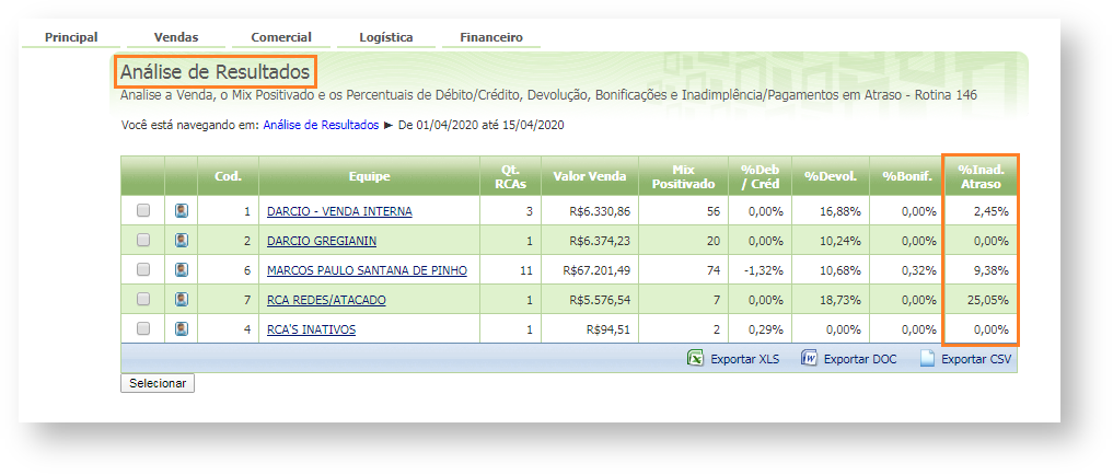 1.3 - O calculo da porcentagem da inadimplência é feito dividindo o valor da inadimplência total do dia pelo valor da venda total do dia, o valor da % de inadimplência mostrado no relatório será de acordo com período informado em filtro, essa visualização pode ser do período como um todo;