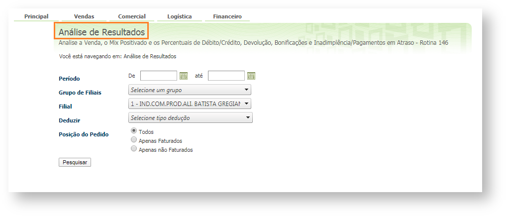 1.2 - Preencha o filtro com as informações que deseja visualizar, como período, filial, se deseja deduzir imposto ou st por exemplo, e se deseja que o relatório traga todos os pedidos, apenas os faturados ou somente os não faturados;