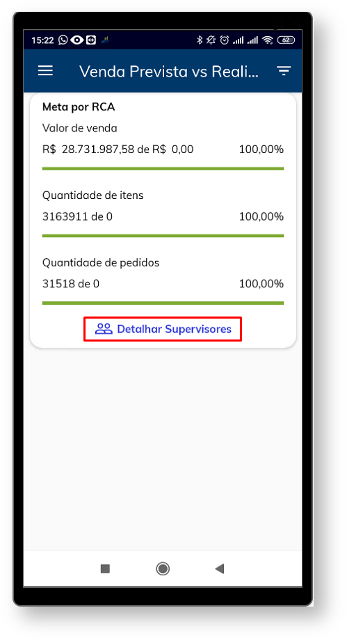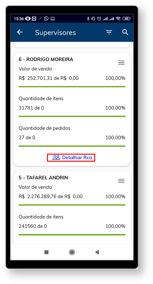 1.1 - Na tela que irá se abrir por padrão já trará Meta por Rca, com informação de Valor de venda, Quantidade de itens e Quantidade de pedidos. Ainda nessa tela ao clicar em Detalhar supervisores irá trazer as mesmas informações na visão por supervisor, onde poderá clicar em detalhar Rca e ter a visão por vendedor.