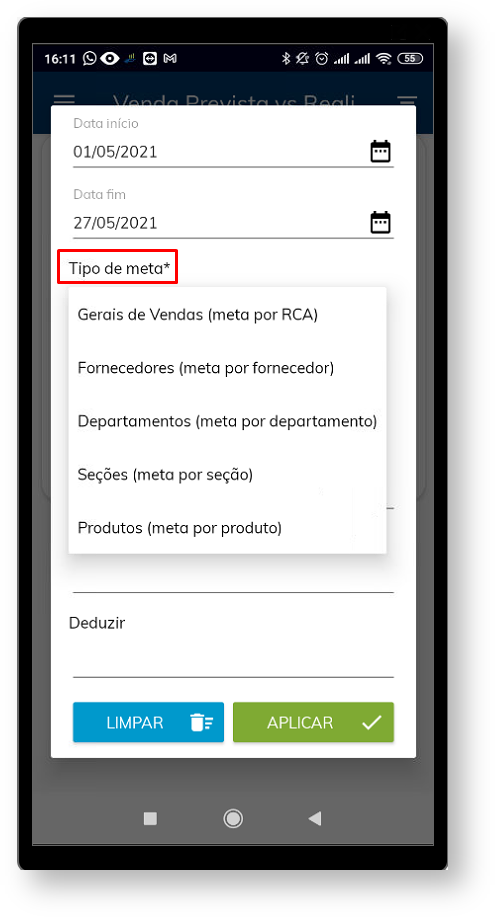 1.3 - Selecione o tipo de meta que deseja que a pesquisa mostre, se é por Rca, fornecedor, departamento, seção ou por produto;