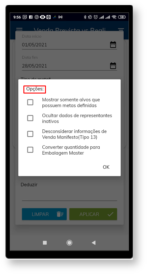 1.5 -Em Opções selecione se deseja que mostre somente alvos que possuem metas definidas, se deseja ocultar dados de representantes inativos, se deseja que desconsidere informações de venda Manifesta ( tipo 13) e por fim se deseja converter quantidade para embalagem master;