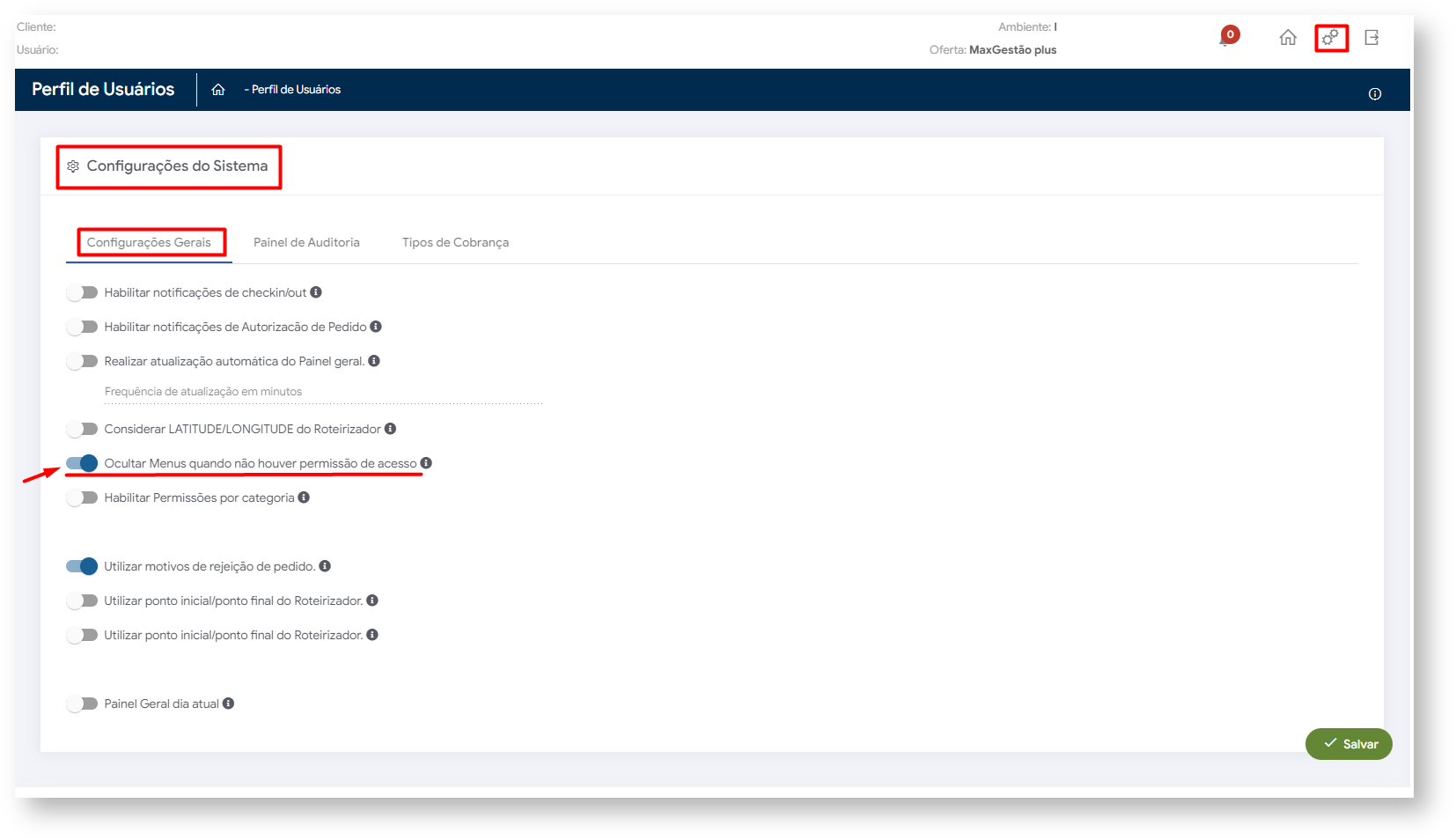 no canto direito superior da tela e em configurações Gerais habilite o parâmetro Ocultar Menus quando não houver permissão de acesso, clique em salvar.