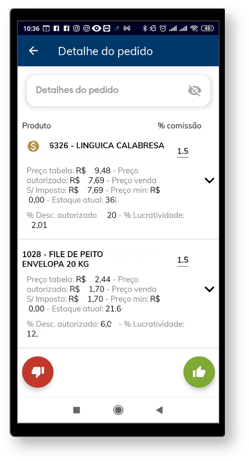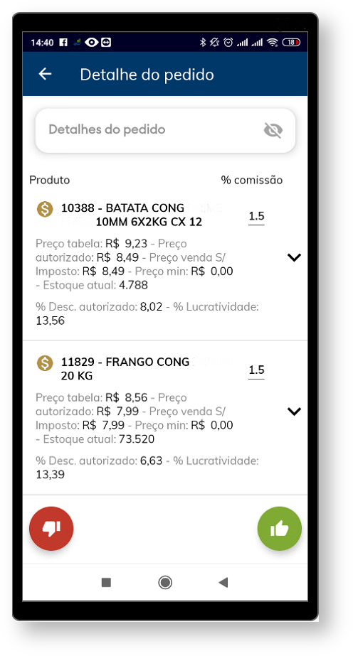 1.3 - Ao clicar em cima do pedido serão visualizados os detalhes dos itens com o nome do produto, preço de tabela, preço autorizado, preço mínimo, % de desconto autorizado, % lucratividade e % comissão;