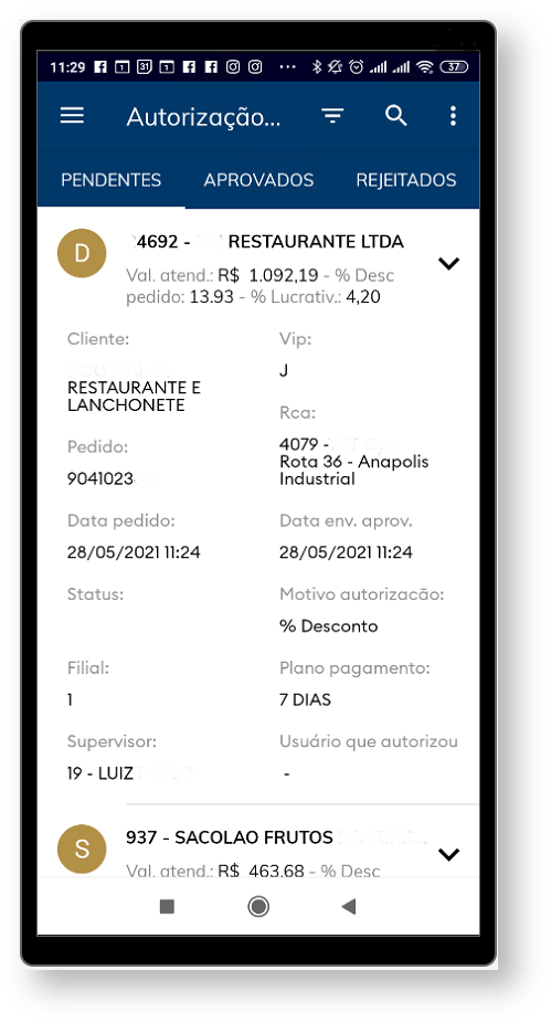 1.4 - Ao clicar na seta a frente do pedido irá mostrar detalhes do pedido como cliente, número do pedido, data, filial, supervisor, rca, data em que foi enviado para aprovação, motivo da autorização, plano de pagamento e o usuário que autorizou.