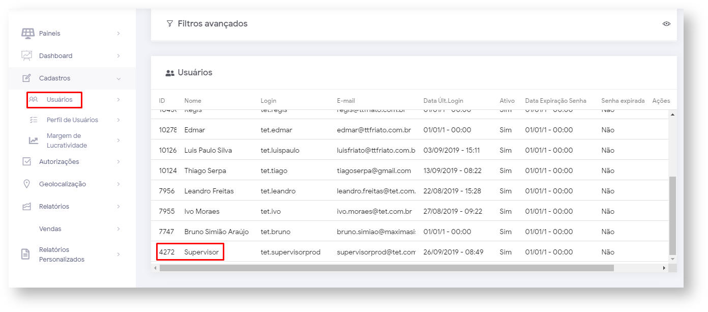4.1 já em cadastro de usuários selecione qual deseja realizar a configuração.