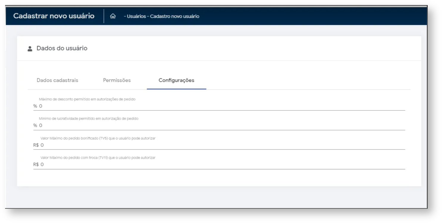 4.3 Já dentro da parte de edição clique na aba configurações, nela é possível cadastrar máximo de desconto permitido em autorização de pedido, mínimo de lucratividade permitido em autorização de pedido ,valor máximo do pedido bonificado que o usuário pode autorizar e valor Máximo de pedido com troca.