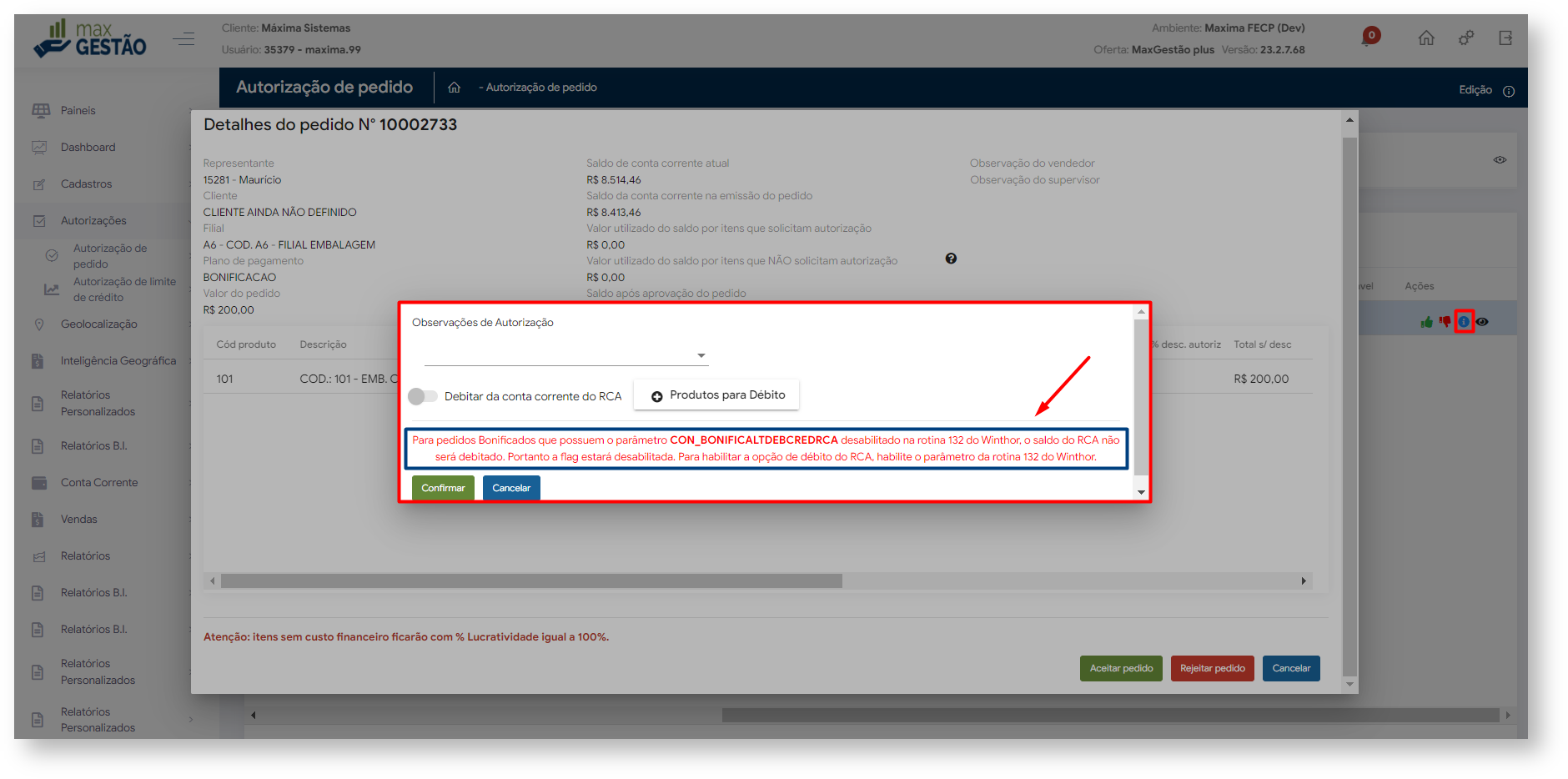 6.3 Caso esteja utilizando o processo de Pedido pendente na autorização e desmarque o parâmetro Utiliza status pendente na autorização de Pedido o maxGestão informará que ao desabilitar a função se houver pedido pendente eles serão automaticamente rejeitados, nesse caso basta confirmar para prosseguir ou cancelar.